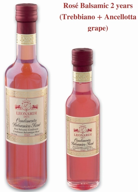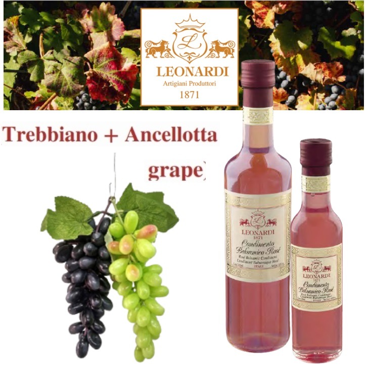 - アンチェッロッタ(赤ぶどう)とトレッビアーノ(白ぶどう)で作られたナチュラルなピンク色のバルサミコ。